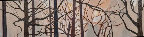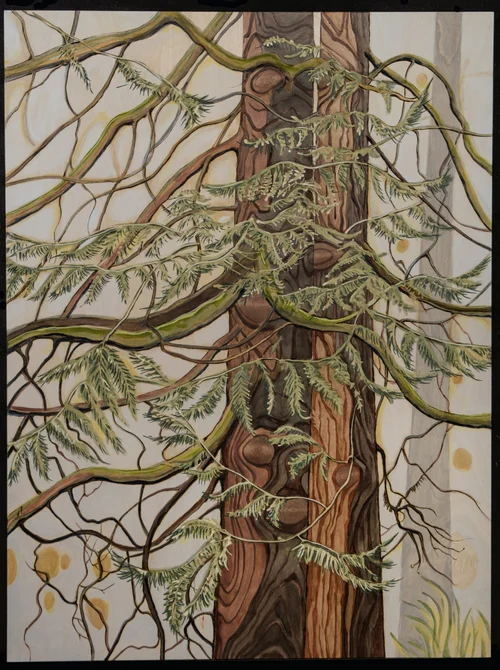 The inspiration for this series came quite simply from a question. A friend of mine was attending one of my art shows when he said, “Are you ever going to paint the top of a tree?” I had spent so much time focusing on the trunks and the space between that it kept me from looking up. This past year I spent more time looking up observing the sky and how the light filters through the moving branches of the Doug Fir Trees. There are times that the Doug Firs appear to be standing strong and still; dark silhouettes that contrast the soft skies. All of this is a new territory for exploration.